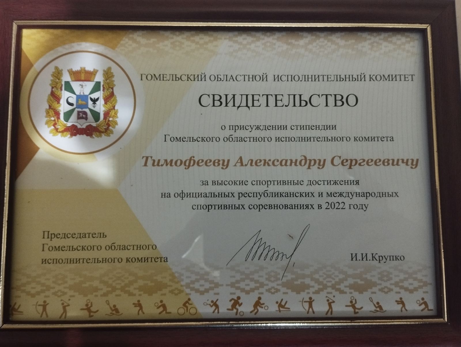 Торжественное чествование атлетов, показавших достойные результаты на официальных республиканских и международных соревнованиях в 2022 году, состоялось 26 января в Гомельском облисполкоме. Особое внимание было уделено и спортсменам паралимпийских видов спорта, в том числе среди людей с нарушением опорно-двигательного аппарата. Сотруднику учреждения «Центр социального обслуживания населения Центрального района г. Гомеля», действующему атлету, мастеру спорта, чемпиону Республики Беларусь по толканию ядра – Александру Тимофееву, была присуждена стипендия за высокие спортивные достижения.